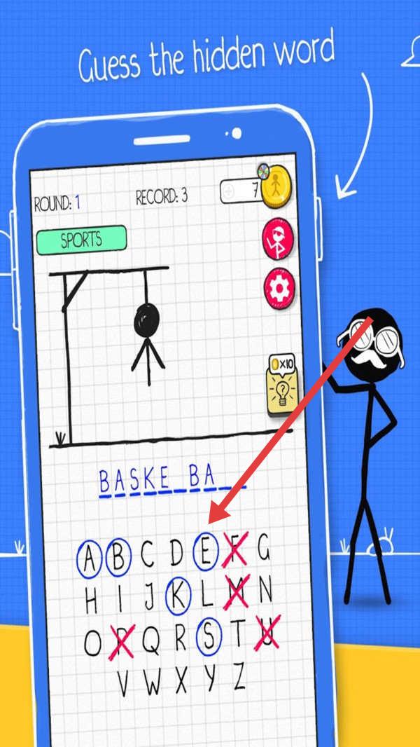 3、在猜词过程中,点击箭头所指的字母(例如E、K、S),填入“BASKE_BA__”中,同时避开标有叉号的字母,以完成解谜。