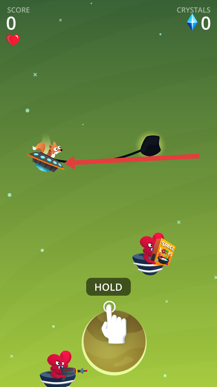1、进入小火狐游太空游戏后,需要长按屏幕【HOLD】的区域,操控小火狐驾驶的飞碟启动,开启太空冒险之旅。
