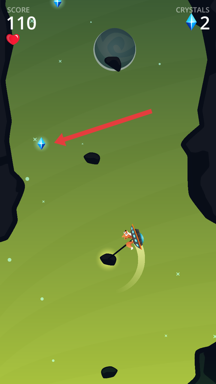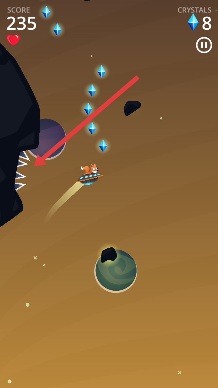 2、在小火狐飞行过程中,需要引导飞碟靠近蓝色水晶并收集,以此提升分数与水晶数量。