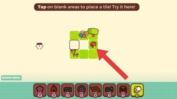 1、玩法是点击空白处放置瓷砖,通过组合不同生物群系瓷砖来搭建场景。图中展示了初始布局和操作指南,强调创意拼接与场景构建。