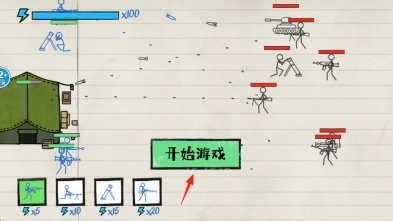 1、点击【开始游戏】,进入关卡选择,用金币招募“拿刀士兵”(红箭头),扩充战力。