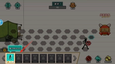 2、“关卡1”布局,确认士兵已招募(红箭头),点击【开战】,触发火柴人对战。