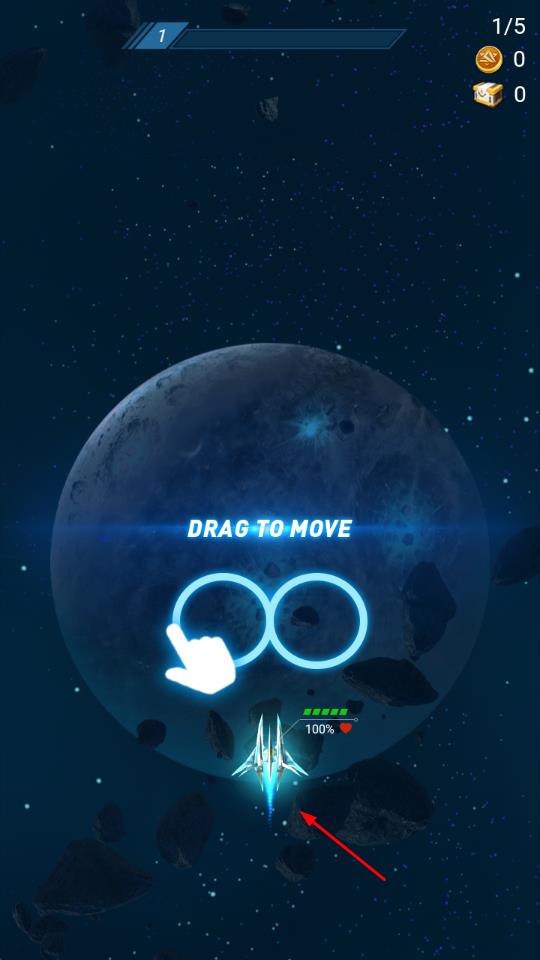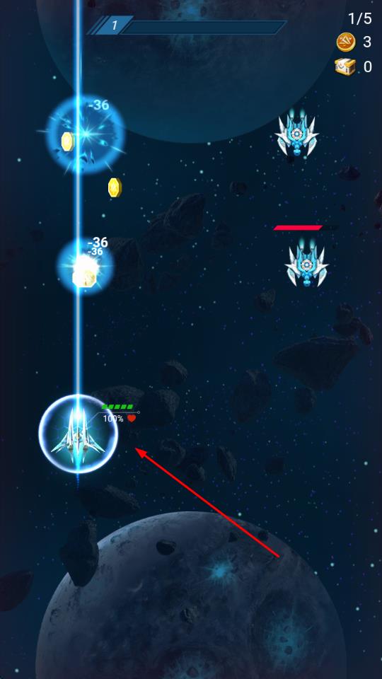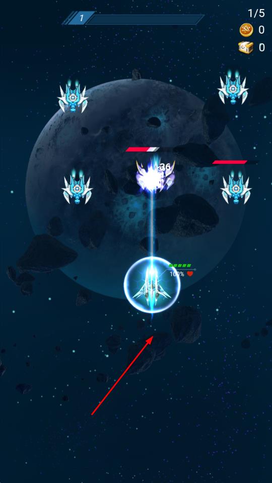 1进入游戏后,从战机选择界面挑选你喜欢的战机,通过滑动屏幕来控制战机在初始的太空场景中移动,并点击射击按钮攻击迎面而来的敌人。