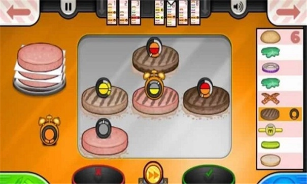 2、烤制肉饼和面皮:玩家需要去烤炉中将肉饼烤制熟透,根据计时器上的指示翻面,同时还要将面皮放置好。
