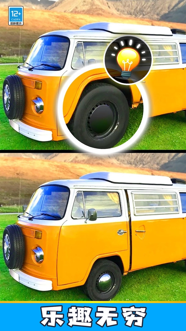 2.提示功能可在卡关时使用,点击灯泡按钮后将自动标出一个未找到的差异帮助继续闯关。