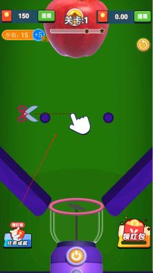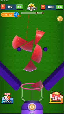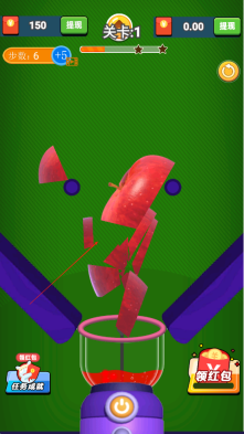 3、当搅拌机的果汁达到满格时完成关卡,根据切割的准确度和连击次数获得红包奖励,解锁更多种类的水果和搅拌机皮肤。