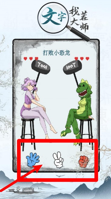 3. 按照上面的指示击败角色,点击下方的手势按钮进行攻击,使用猜拳策略战胜小恐龙以完成关卡。