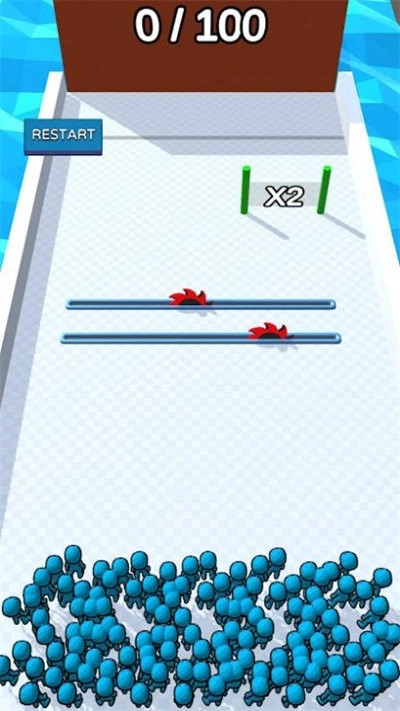 2、看到蓝色小人的队伍正沿着桥前行,点击屏幕操控他们躲开红色敌人,记得收集加分道具哦。