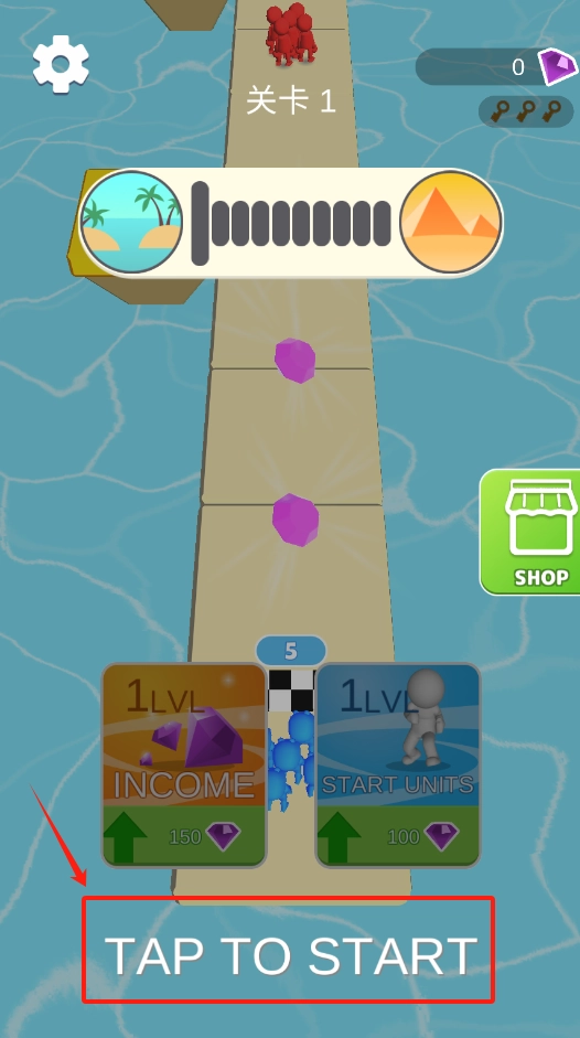1. 点击红色框内醒目的“TAP TO START”按钮来开启游戏,操控小人队伍顺着曲折的桥梁前行。