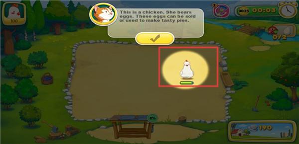 2、进入游戏开始新手教学,这是一只鸡,它可以下蛋,这些鸡蛋可以出售或用来做美味的馅饼。