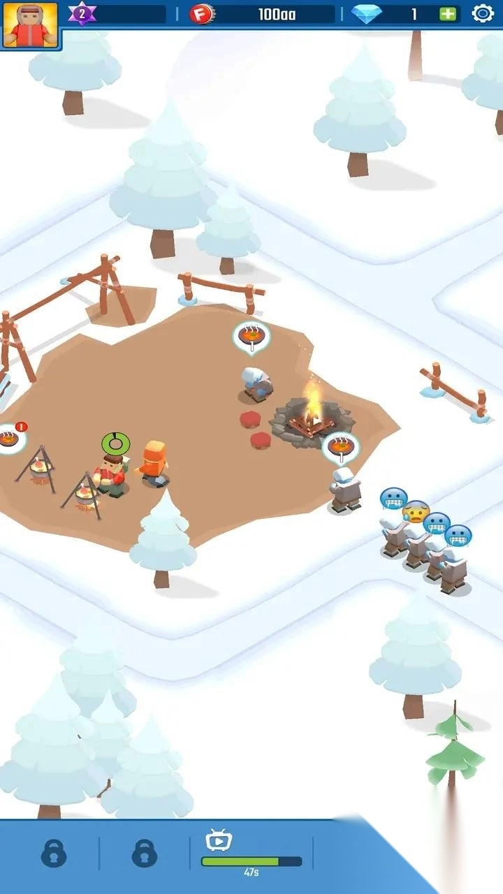 2、呈现雪地场景中的营地,有篝火、角色互动等元素,玩家可经营管理,发展冰雪村庄,包含运营玩法。