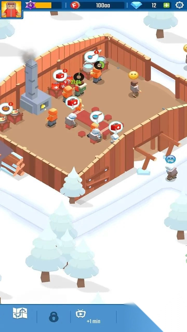 1、展示雪地环境中的建筑物,其中包含角色互动。玩家可以进行经营管理,发展冰雪村落,包括角色指派、设施运作等多种玩法。