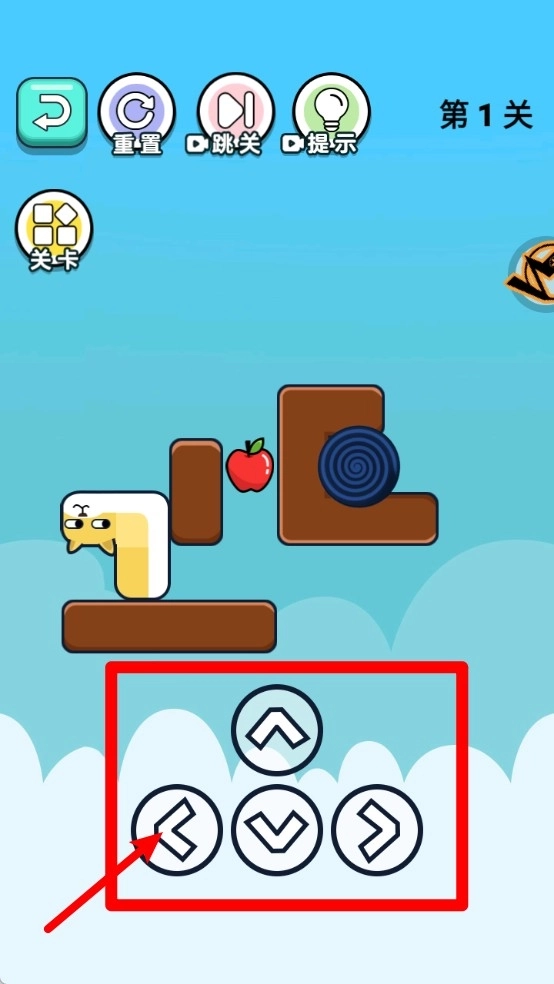 2.点击下方方向按键控制角色行动方向,合理操作可帮助你吃掉苹果并成功抵达终点。