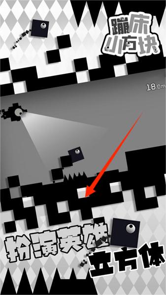 1、操控方块在黑白几何场景蹦跳,躲避尖刺等障碍,扮演英雄立方体前行。