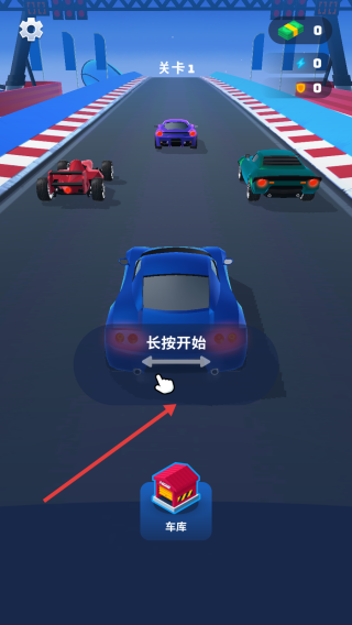 1、关卡1起始页,长按【长按开始】,驾驶蓝色赛车出发。