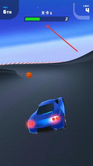 2、在赛道上避开障碍物(如篮球),按照路线行驶,提高名次(从第6名向前提升)。