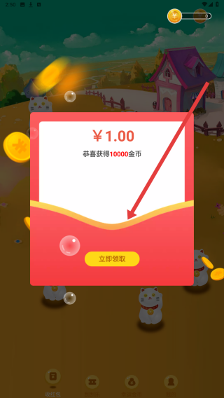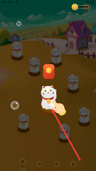 2、看到红包后,跟随箭头指引,点击招财猫,领取红包,开启奖励结算,获取金币或现金奖励。