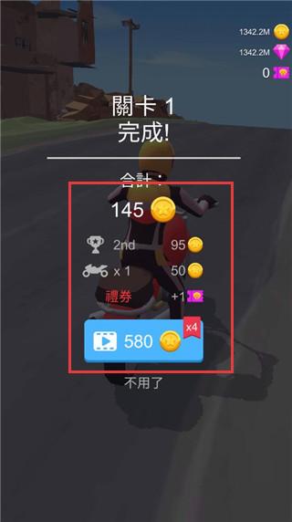 3、通过可以获得游戏金币奖励,金币奖励可以用来升级鞋子和摩托提升自身战斗力和摩托性能。