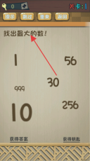 2、关卡1,按【找出最大的数】提示,对比数字(1、56等),选“999”(个头最大),完成答题。