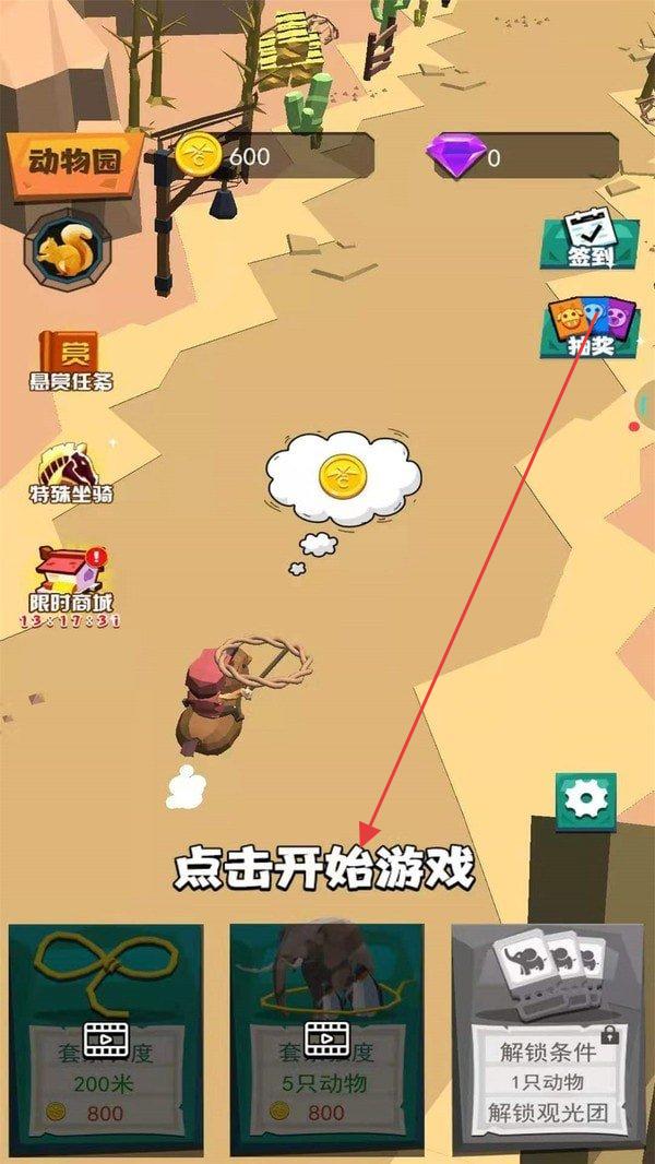 2、返回主场景,点“点击开始游戏”,操控角色骑乘动物(如马、大象),在地图探索、完成任务(套动物、解锁观光团等)。
