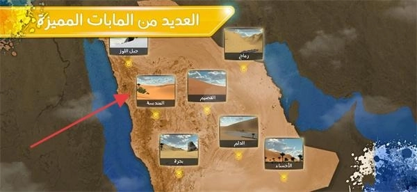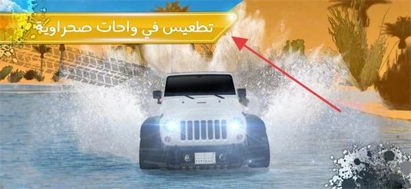 1、首图文字“在沙漠河谷中驰骋”(تطعيس في وادات صحراوية),点击越野车,开始沙漠竞速。