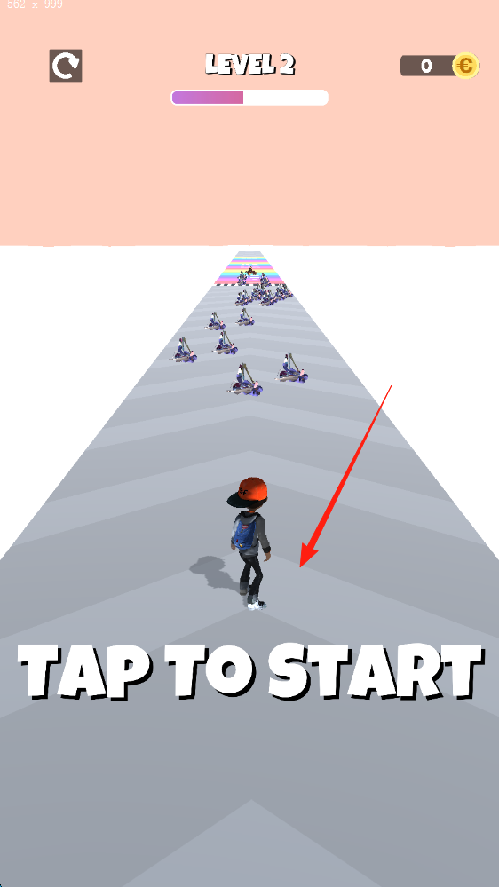 1、点击TAP TO START,操控角色在道路奔跑,躲避滑板车,收集金币。