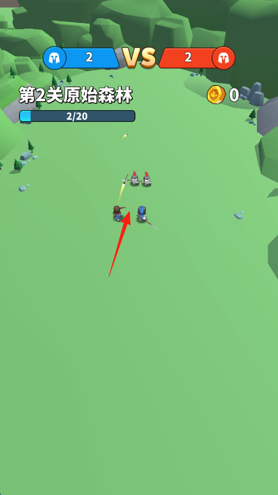 2、在战场(红箭头),操控士兵移动,接近敌方(红色)单位,自动触发战斗,推进关卡进度(1/20)。