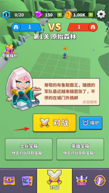 1、点击【对战】(红箭头),进入第一关(原始森林),指挥士兵(蓝色),对抗雷德军队。