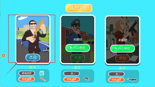 1、在角色选择界面,点击红框中的"杰克"角色,查看其"缓慢时间"特殊技能的说明,并留意下方两个尚未解锁的特殊道具栏位,这些栏位提示了未来可以解锁的内容。