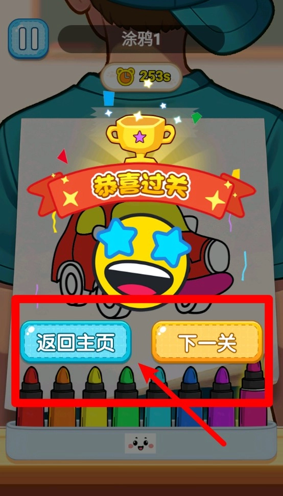3. 过关奖励界面:当完成涂鸦后,系统会呈现通关画面,此时玩家能够选择继续挑战下一关,或者返回首页。整个流程简洁顺畅,不会打断创作的热情。