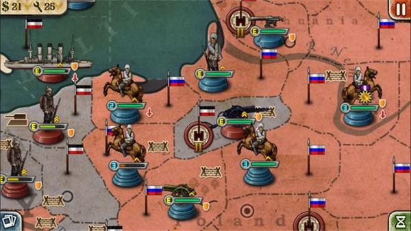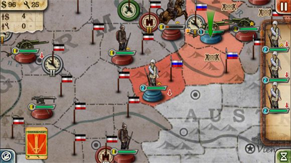 2、第一天,在华沙和波兰西南角的一级工厂里造3门大炮(华沙1门,西南角2门),先用西南角的大炮轰一下旁边西里西亚的德国步兵(要打到他掉一大半血,否则重来),华沙的大炮轰波兰西北角的德国机枪兵