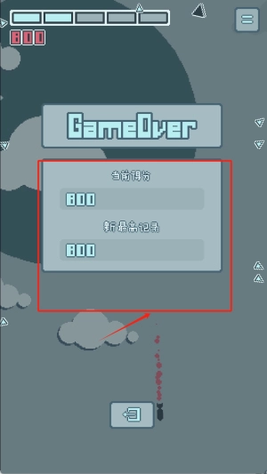 2、若飞机触碰到画面边界,左上角的血条便会迅速减少。若持续碰撞,就会触发“GameOver”界面,该界面会展示当前得分以及800分的历史记录。