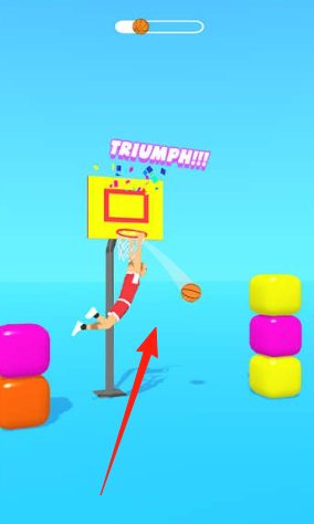 1、扣篮挑战控制红衣篮球角色,在蓝色场景,跳跃穿过障碍(彩块),完成扣篮,屏幕显示“TRIUMPH!!!”庆祝。