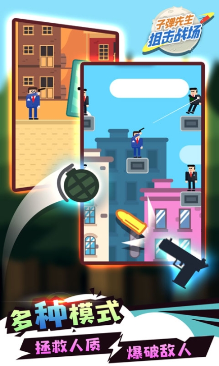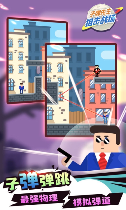 子弹先生狙击战场是一款卡通风格趣味性射击游戏。在游戏中,你将要接受一项神秘的射击任务挑战,面对不同的敌人,间谍,特工,僵尸,伐木工,外星人等,你需要开动大脑思维,控制自己的人物角色在不同的地图场景中进行冒险闯关,使用独特的武器,利用有限的子弹和弹射方式将不同的目标消灭掉,解救人质,注意找好角度噢!