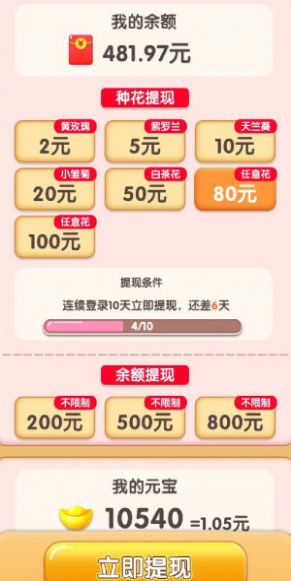 四季养花红包版是一款画面色彩绚丽的模拟养成类游戏。在游戏里,玩家可依据自身各种不同的想法展开挑战,这一过程不仅能锻炼个人的管理能力,而且种植面积还能持续拓展。玩家在游戏中能获取数额颇为可观的资金,随着资金的积累,便能逐步解锁并使用合适的道具,整个游戏过程极具解压效果。