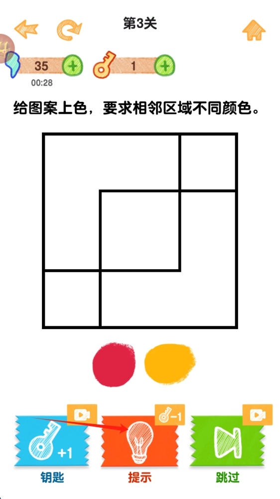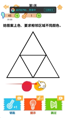 1、点击上色,通过发现共性特征找到解决方案,利用连续成功闯关触发"思维加速"状态,通过暂停功能调整策略与查看提示。