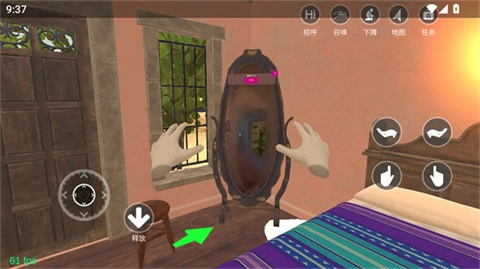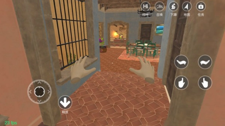4、在操作界面中,左边摇杆用于控制移动方向,玩家只需拖动屏幕就能转换视角。右边区域,从左到右、从上到下依次是 “给”“索取”“用左手拿”“用右手拿” 。而右上角的 “召唤” 功能,能使小忍跟随玩家行动。