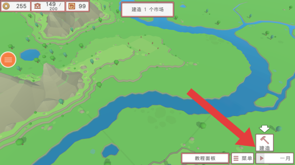 2、屏幕上显示建设任务(例如建造1个市场)以及操作按钮(如建造、菜单等),玩家需要在古代中国的背景下进行城市的建设和管理,这是一种模拟经营类型的玩法场景。