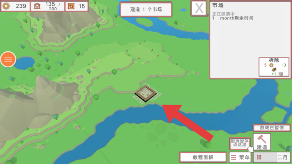 3、展示“建造1个市场”的任务,市场正在建设中(还需1个月完成),界面上有建造、菜单等操作按钮,呈现出古代中国城市建设和管理的模拟经营场景。