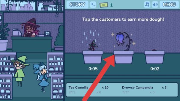 1玩家将扮演一名店主,经营一家药草店。通过点击顾客、培育植物(例如“DrowsyCampanula”)等方式来推进游戏。画面中会展示店铺的场景、植物的培育进度以及操作指南,让玩家能够体验到充满魔法主题的经营乐趣。