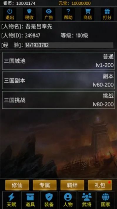 重生三国我欲修仙版是一款融合了角色扮演和策略战斗的冒险游戏,玩家需要培养自己的角色,收集资源和装备,并与其他玩家进行战斗。还要注意策略的运用和技能的搭配,并不断调整自己的战术来应对不同的挑战,最终目标是成为最强大的修仙者。