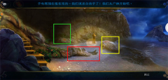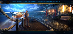 7、返回悬崖,在阴影处使用手电筒。先点击红框区域放大,对尸体使用照相机留存证据。接着点击尸体头部的布将其移开,再对尸体脸部使用照相机留存证据。随后点击尸体手上的手表获取证据,然后点击掀开尸体身上的衣服,找到钱包,得到钱包里的密码图案。之后点击黄框处的小船放大,点击移开救生圈,在小船左侧有绳子的地方使用充气浮标,接着使用打气筒(抽气泵),多次点击小船后获得马克的钱包,阅读钱包里的纸条得到线索。最后点击钱包左侧,拿到卡片。再点击绿框区域放大,使用剪枝钳,得到里面的第二个金字塔碎片。
