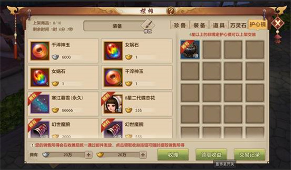 少侠租赁摊位后,就能把想要售卖的物品摆到自己的摊位上。能够用于摆摊出售的物品包含:7星及以上普通二代珍兽、非绑定套装以及7星及以上打造装备、非绑定流通道具、非绑定紫色品质及以上的万灵石,还有4星及以上的非绑定护心镜。设定好出售价格,相应物品便会在摊位已上架界面显示出来。