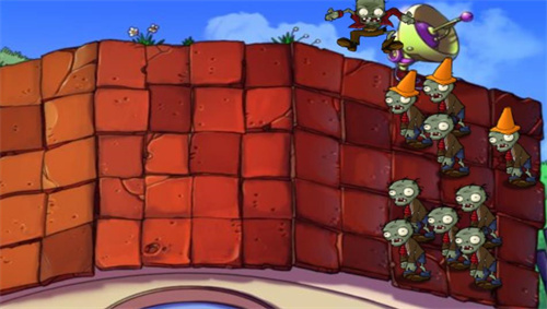 2、游戏中的僵尸并非全都赤手空拳,有些僵尸装备了铁桶(铁桶僵尸),有些则头戴三角锥,还有身穿橄榄球护具或手持铁门(铁栅门僵尸)作为防护。部分僵尸能够利用撑杆跳过植物(撑杆僵尸),另一些则借助气球飞越植物(气球僵尸)。游戏中某些大型僵尸(巨型僵尸,又称伽刚特尔)甚至可以直接摧毁植物。此外,还有模仿迈克尔·杰克逊形象的僵尸(舞王僵尸),它们能够召唤从地面冒出的四只僵尸(伴舞僵尸),并随着舞步前进。
