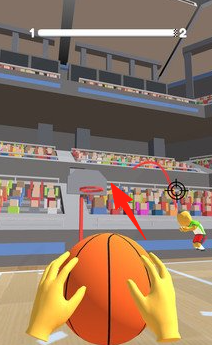 2、投篮操作接球后,调整角度、力度,瞄准篮筐(红箭头轨迹),避开防守球员,完成投篮,争取得分。