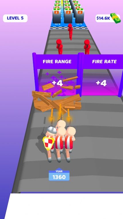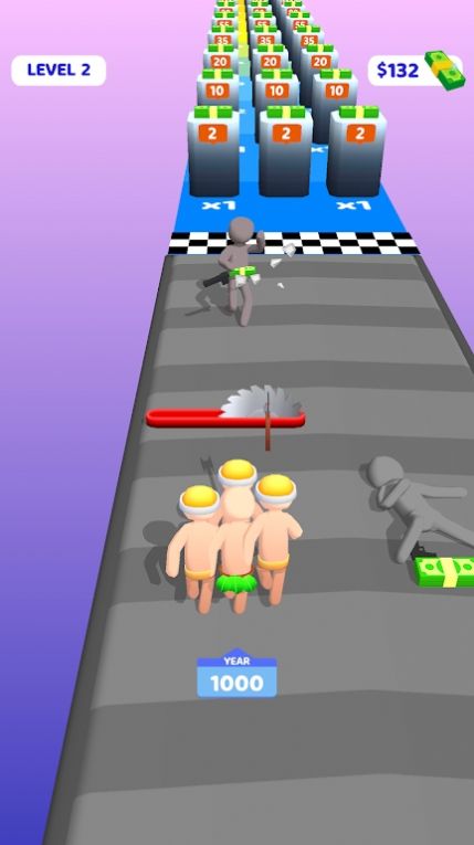 1、需要控制一队可爱的角色,通过合并来升级并在跑酷中收集资源。