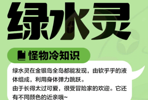 绿水灵这个怪物在游戏里面的属于外形非常可爱的怪物的一种,玩家想要找到它最简单的方法就是围着金银岛多转悠,毕竟它绿油油的身体还是很容易能够让玩家们瞬间发现它的,玩家们如果发现了不是绿色,但是长的很像绿水灵的小怪物,是不用感觉奇怪的。