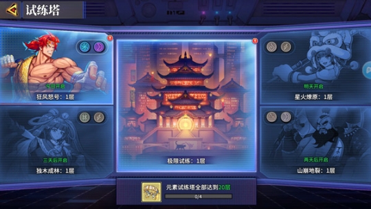 【元素试炼塔】分为4个不同元素的塔,分别是狂风怒号、独木成林、星火燎原和山崩地裂,对应风、林、火、山四种元素。挑战时只有用规定的两种元素的武道家才能参战。每天开放一种元素塔,当天最多挑战10层。