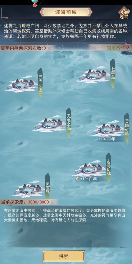 迷雾之海第一个大地图中的第一个小地图涯海前域满3000探索度后,到达涯海中域,可以探索出火云岛,产出一品灵核。
