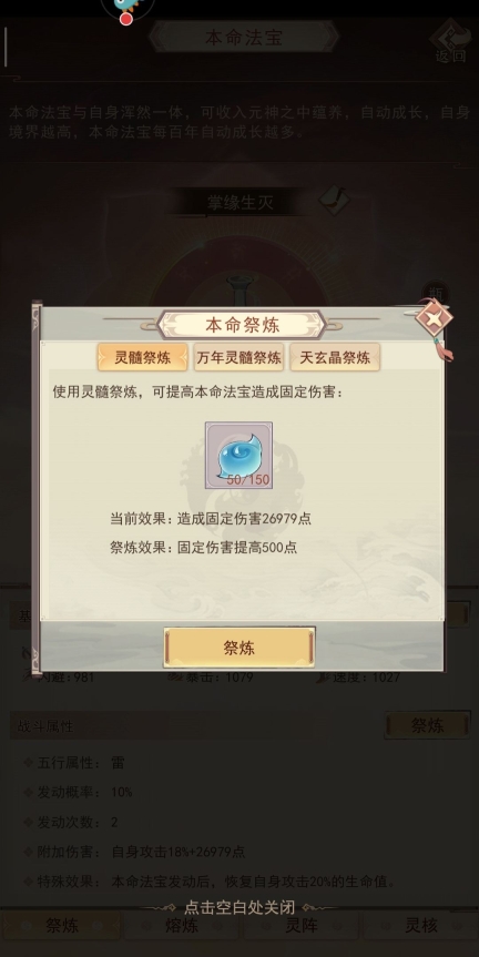 注意:若要更改本命法宝的外观,需消耗1000荣华天功德来购买化灵晶;而更改本命法宝的名称,则需要10亿修为。